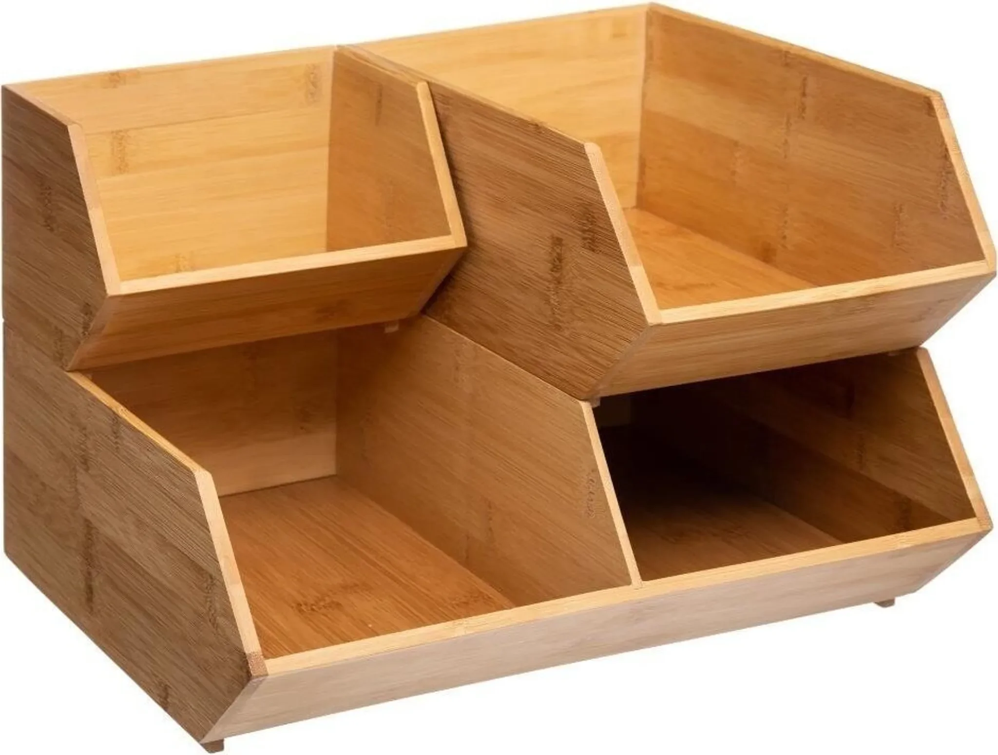 Die offene, leicht geneigte Front ermöglicht einen schnellen Zugriff auf den Inhalt, während die stabilen Bambuswände für Langlebigkeit sorgen. Das natürliche Material unterstützt eine gute Luftzirkulation, wodurch frische Lebensmittel länger ansehnlich bleiben. Dank des geringen Gewichts lässt sich der Organizer flexibel einsetzen und leicht transportieren.