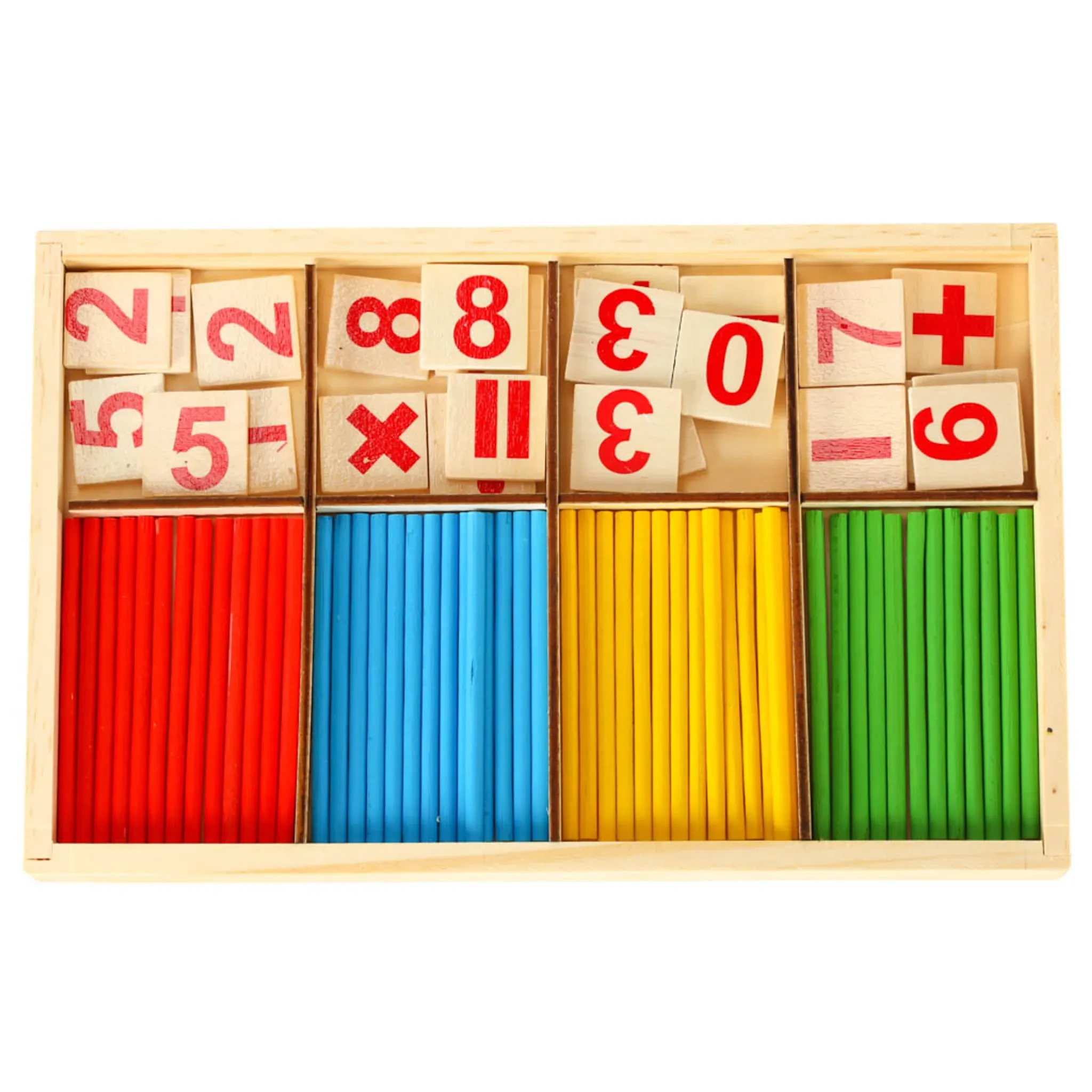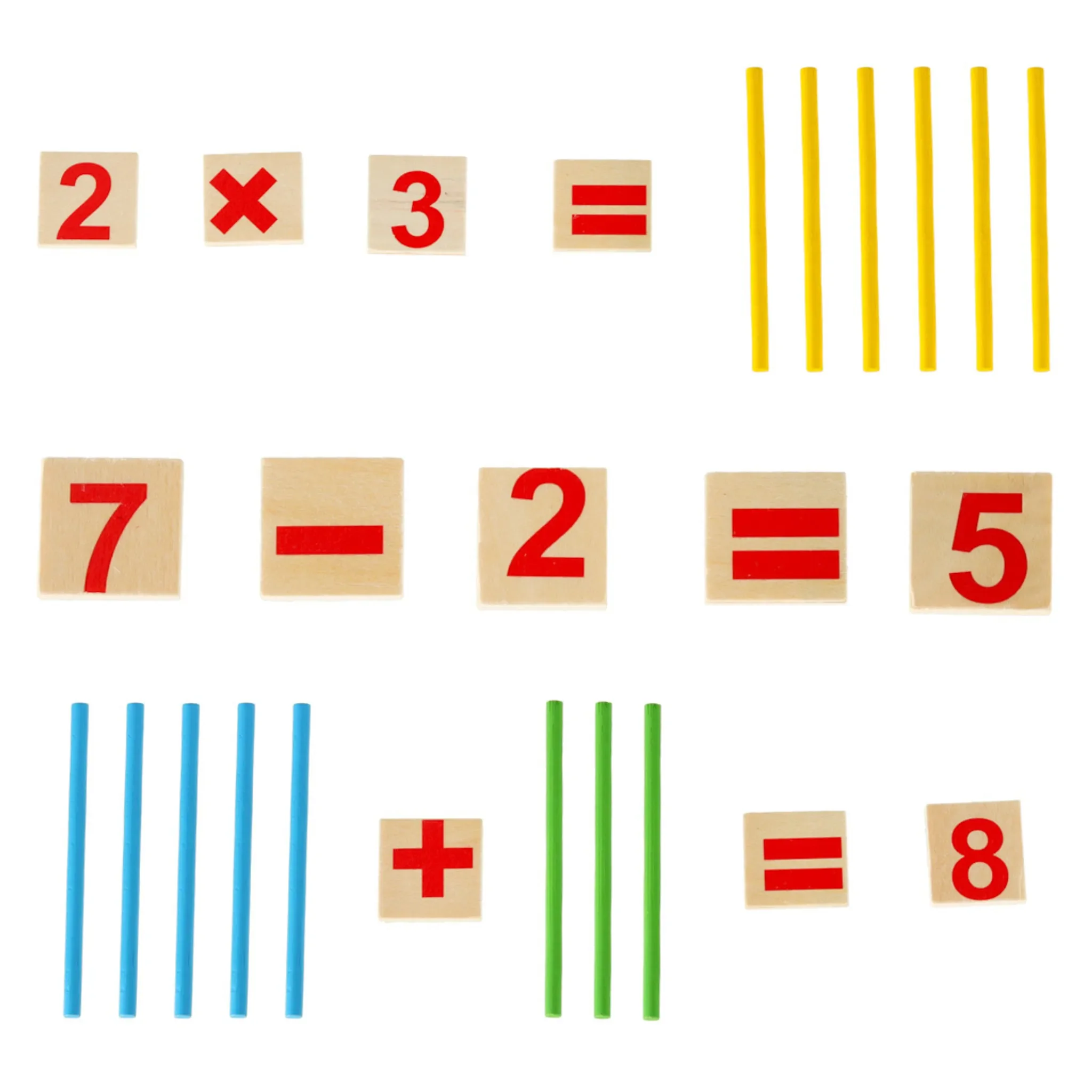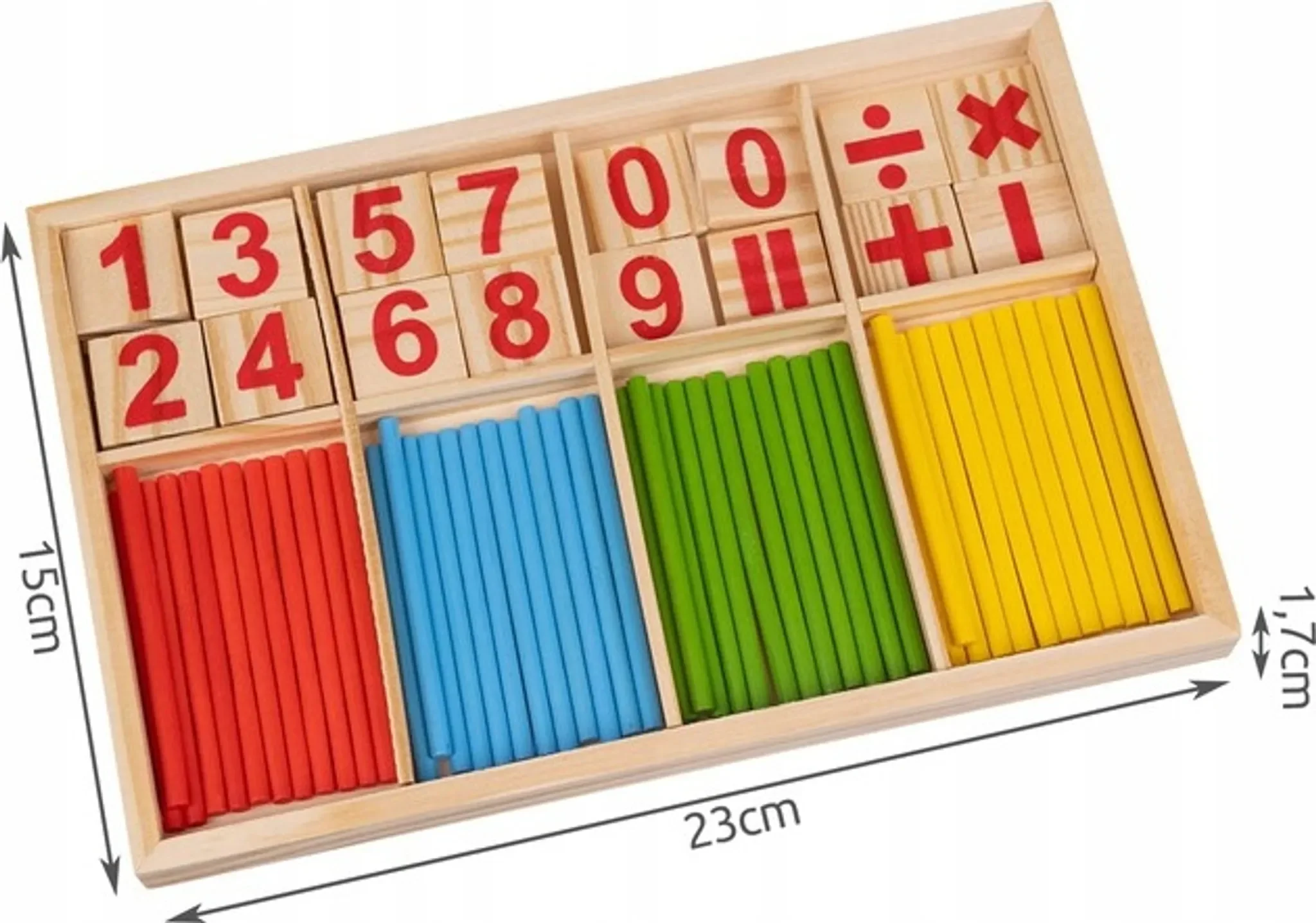| Im Paket | 48 × farbige Zählstäbe, 19 × Zahlen, Plus-, Minus-, Multiplikations-, Divisions- und Gleichheitszeichen |