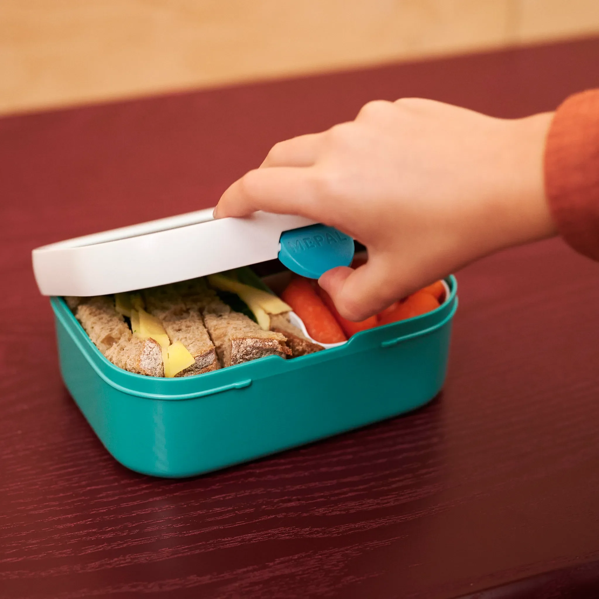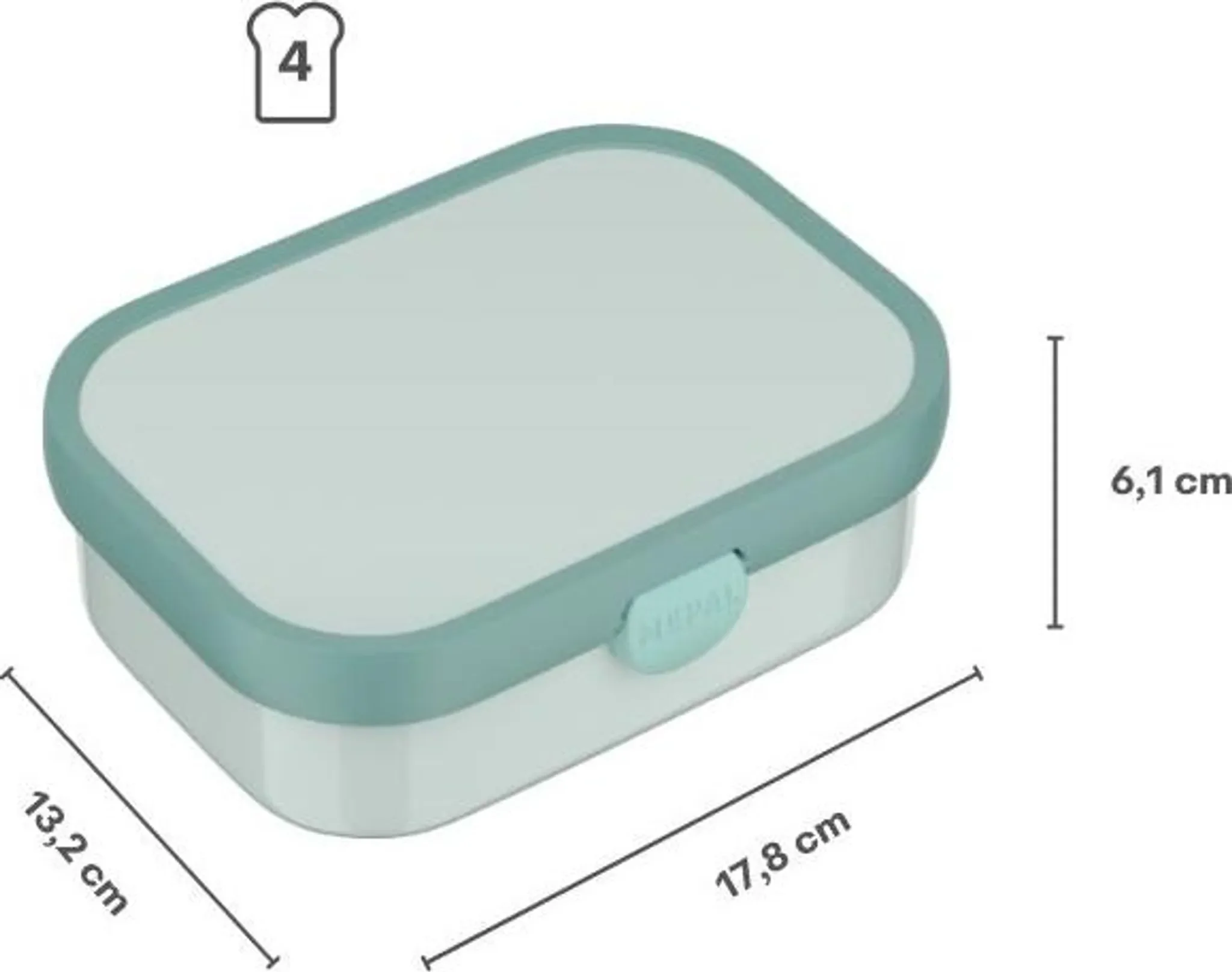 Zwei separate Bento-Elemente sorgen dafür, dass alles frisch bleibt. Wird mehr Platz benötigt, lässt sich der Einsatz unkompliziert entnehmen – so passen auch mehrere Sandwiches hinein. Der zuverlässige Clip-Verschluss macht die Box kinderleicht zu öffnen und sicher zu schließen.