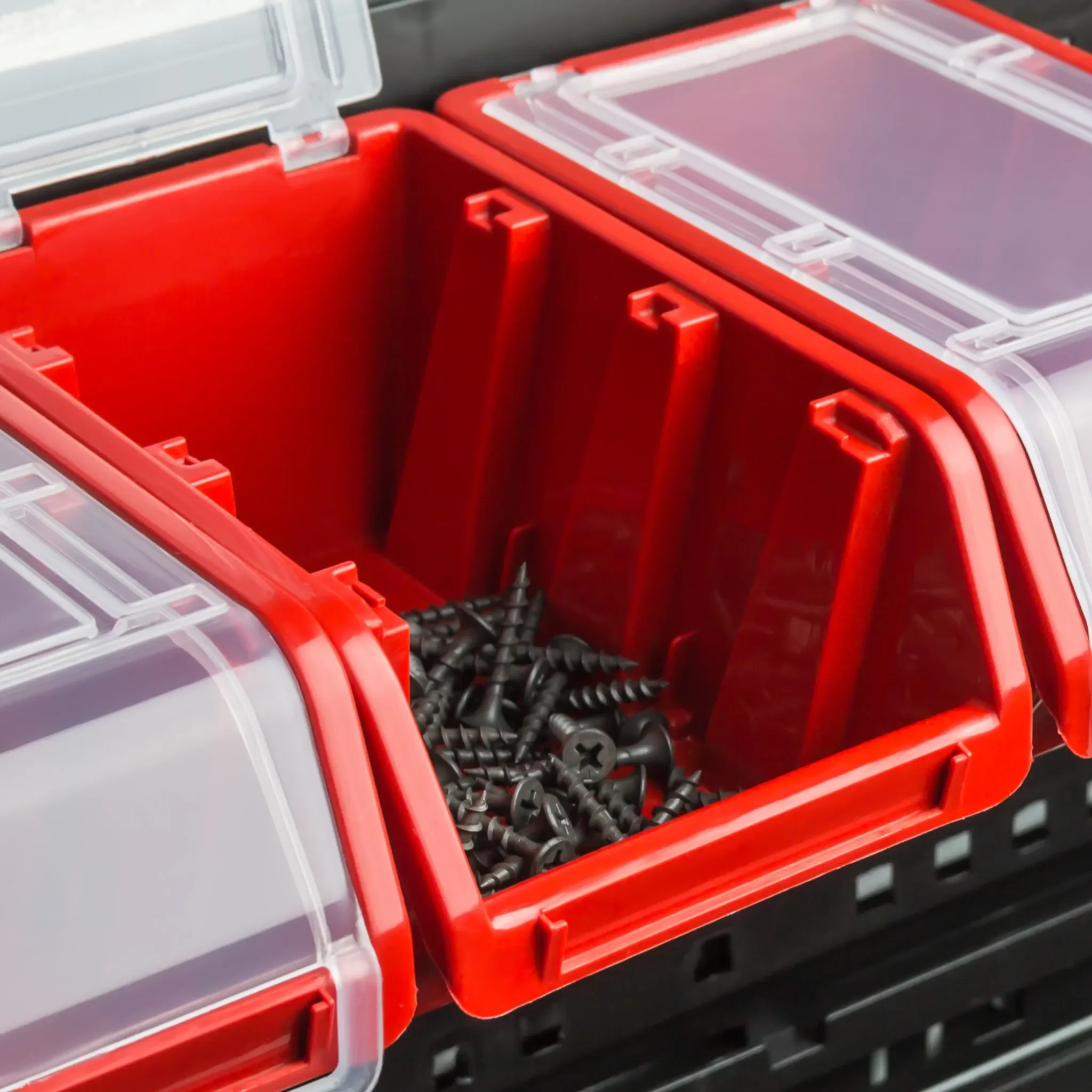 Highlights: Sicher stapelbar, Inhalt jederzeit sichtbar, vielseitig einsetzbar, kompatibel mit Wand- und Regalsystemen.